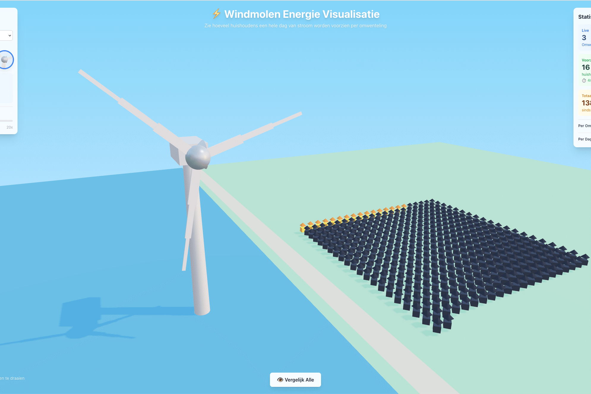 Deze applicatie heb ik gemaakt uit eigen interesse. Iedere keer als ik langs een windmolen reed, vroeg ik me af hoeveel stroom zo'n windmolen nou precies opwekt. Hoeveel huizen voorziet een zo'n windmolen nu van stroom? En hoeveel stroom levert één omwenteling precies op? Met deze applicatie wordt dit visueel gemaakt.
